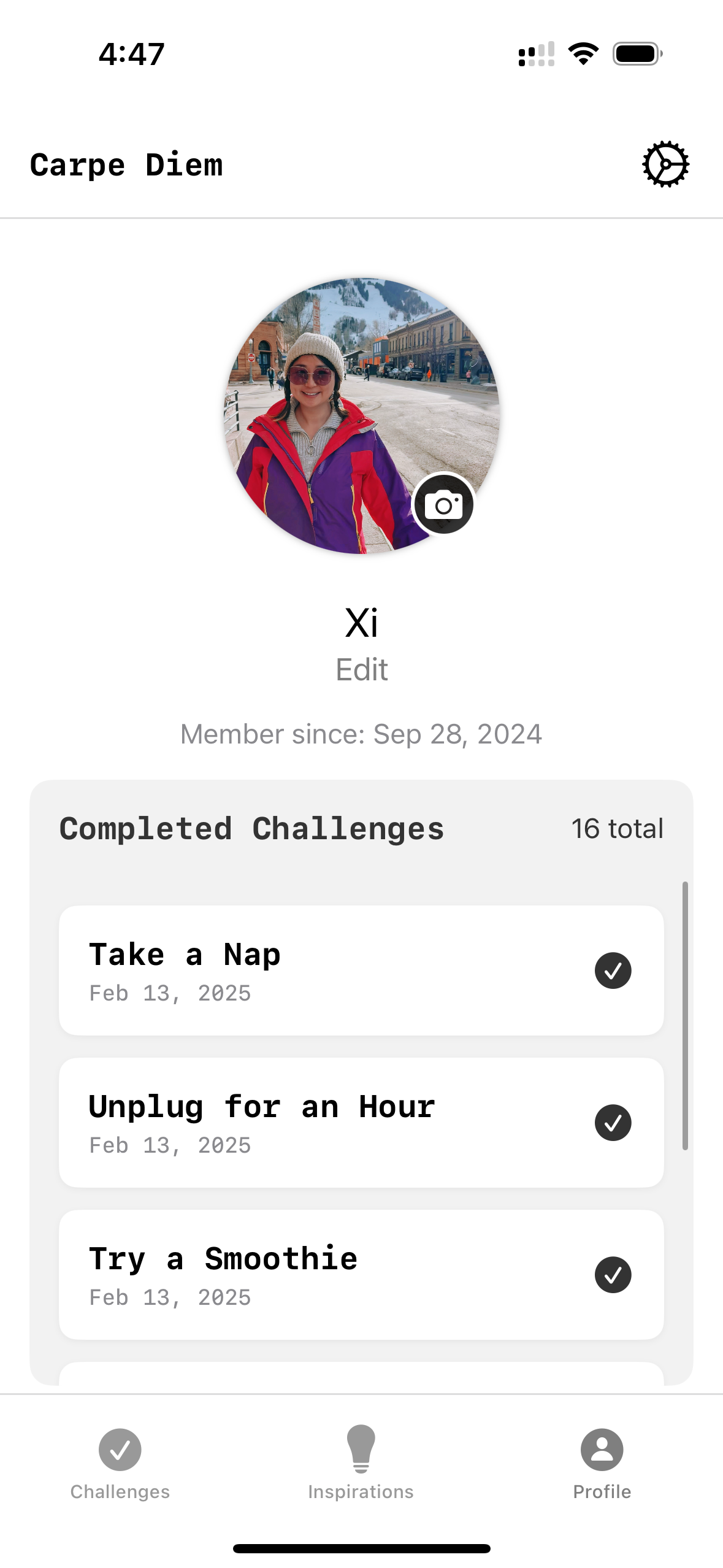 The app - CarpeDiem, delivers a new wellness challenge each day, and I managed the entire process: from defining the MVP to deploying the app for testing.